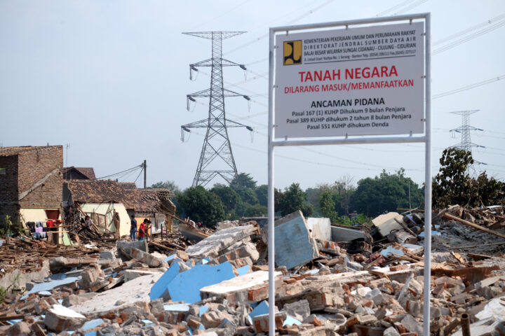 Plang tanah negara terpasang diantara reruntuhan puing-puing rumah Sukadana yang dirobohkan di Lingkungan Sukadana, Kecamatan Kasemen, Kota Serang, Minggu, 20 Juli 2025.