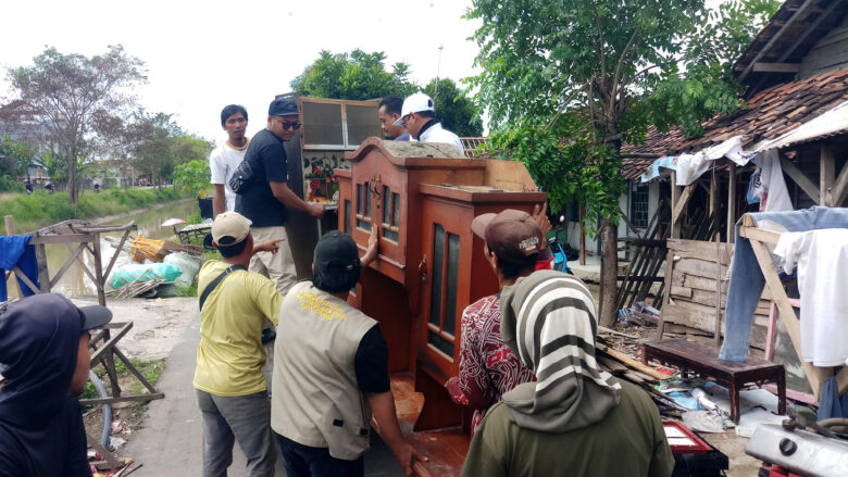 Petugas membantu mengangkut barang-barang warga di sepadan Kali Pembuang Cibanten, yang pindah di Lingkungan Sukadana, Kecamatan Kasemen, Kota Serang, Rabu, 9 Juli 2025.