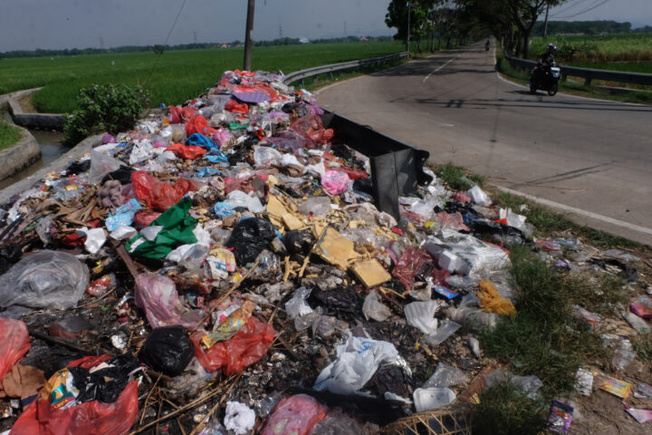 Tumpukan sampah ini nyaris meluber ke jalanan, namun tertahan oleh pagar besi pembatas jalan.
